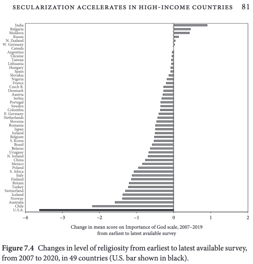 Exceptions like Turkey were never unheard of. In fact, the United States long occupied a similar place in the literature as an outlier—what Tocqueville described as a nation pairing a secular constitution with unusually high levels of personal religiosity. This case was often taken to show that religion’s role as a social force was not inherently antithetical to modernity, many argued, but could coexist with democratic institutions and economic development.